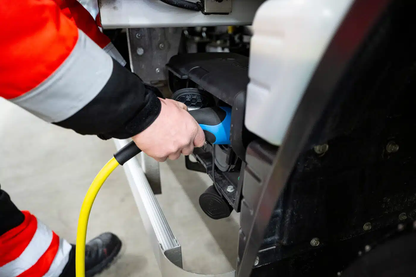 “Maar voor mijn comfort in de cabine is gezorgd, ik heb het altijd aangenaam warm”, lacht Sami Määttä. Daarvoor en voor een grotere actieradius zorgt het zogenaamde optionele Performance-pakket. Het bestaat uit stoelverwarming, stuurwielverwarming en voorruitverwarming. Zo kan de normale cabineverwarming afhankelijk van het weer volledig uitgeschakeld blijven of, zoals in dit geval, alleen op zuinige 18 graden draaien. “Dat is veel minder dan we in onze dieselvrachtwagen moeten instellen om het warm te krijgen”, bevestigt de Finn. “Wat ik ook erg leuk vind, is dat het laden zo eenvoudig is, dat het direct in onze hal plaatsvindt en dat ik ondertussen andere dingen kan doen. Dat is toch een stuk comfortabeler dan buiten bij het tankstation in de kou rond te staan.”